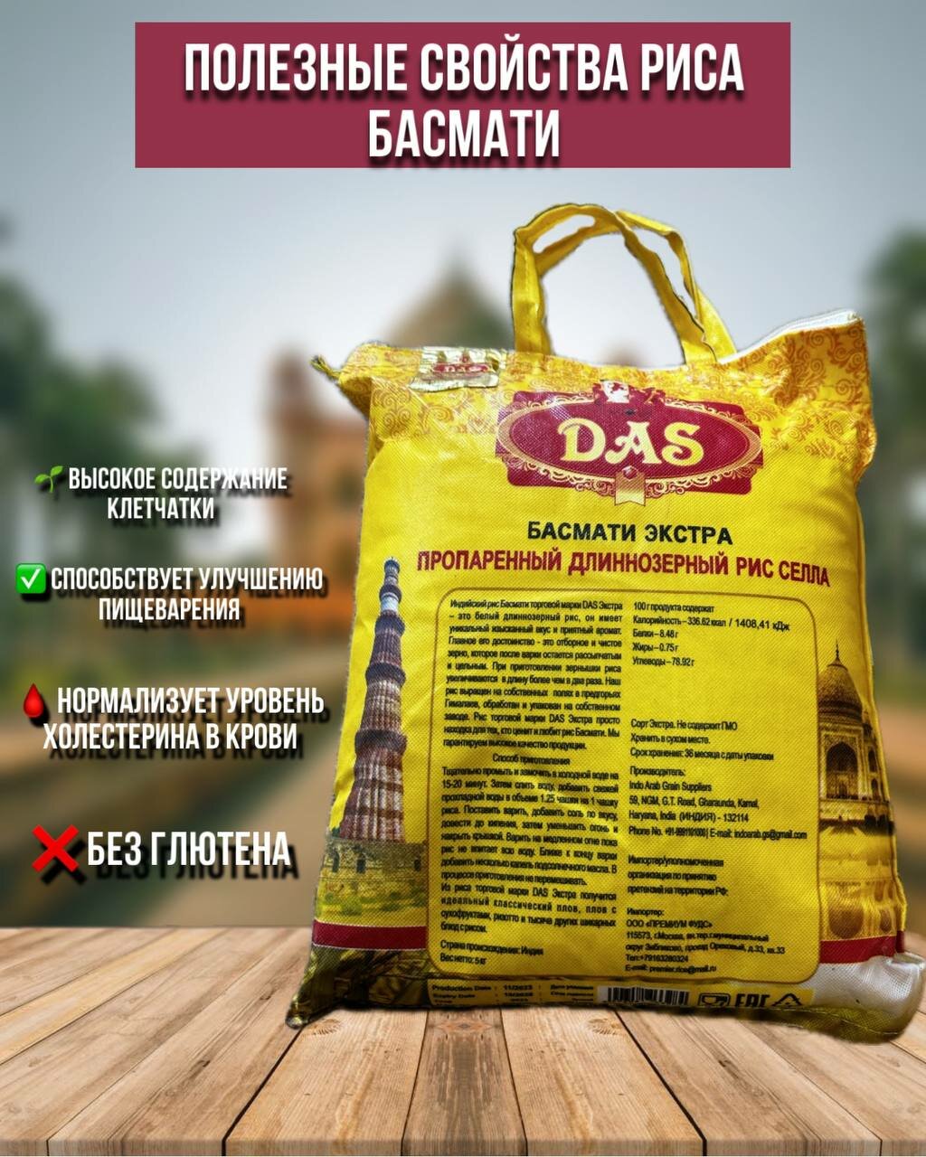 Рис, крупа индийский Басмати Das Extra пропаренный для плова 1 кг упаковка мешок информация: