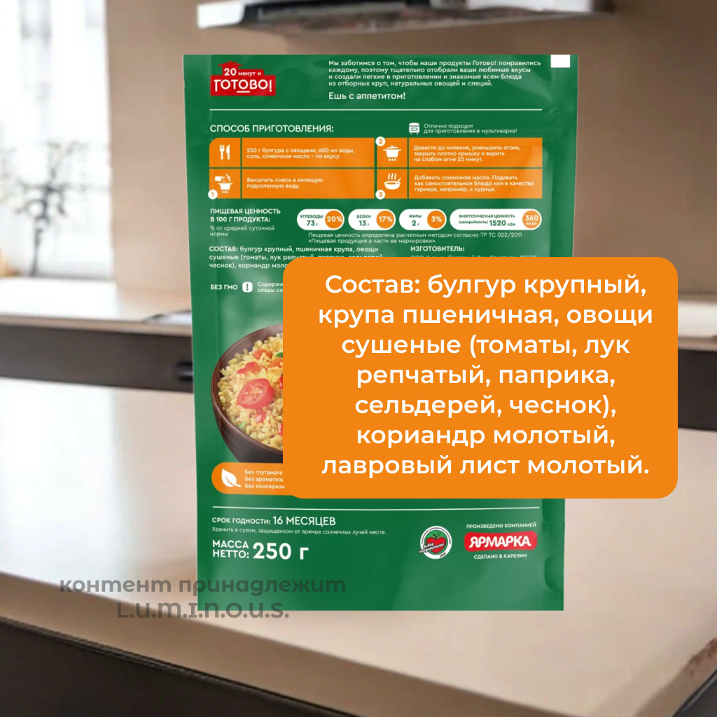 Состав | Булгур крупный, пшеничная крупа, овощи сушеные (томаты, лук репчатый, паприка красная, чеснок), кориандр молотый |