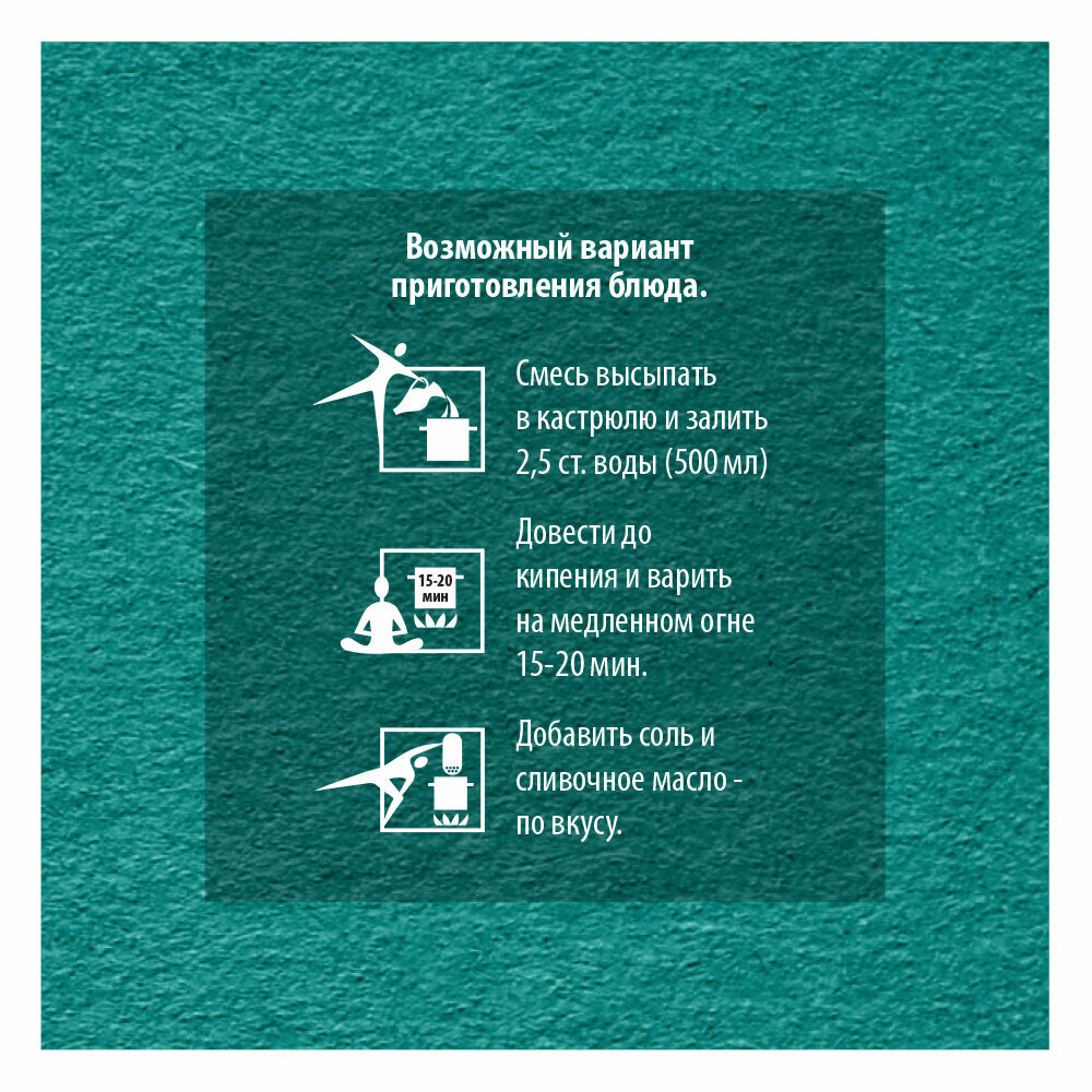 | Способ приготовления | Смесь высыпать в кастрюлю и залить 2,5 стаканами воды (500 мл). Довести до кипения и варить на медленном огне 15-20 мин. Добавить соль и сливочное масло по вкусу. |