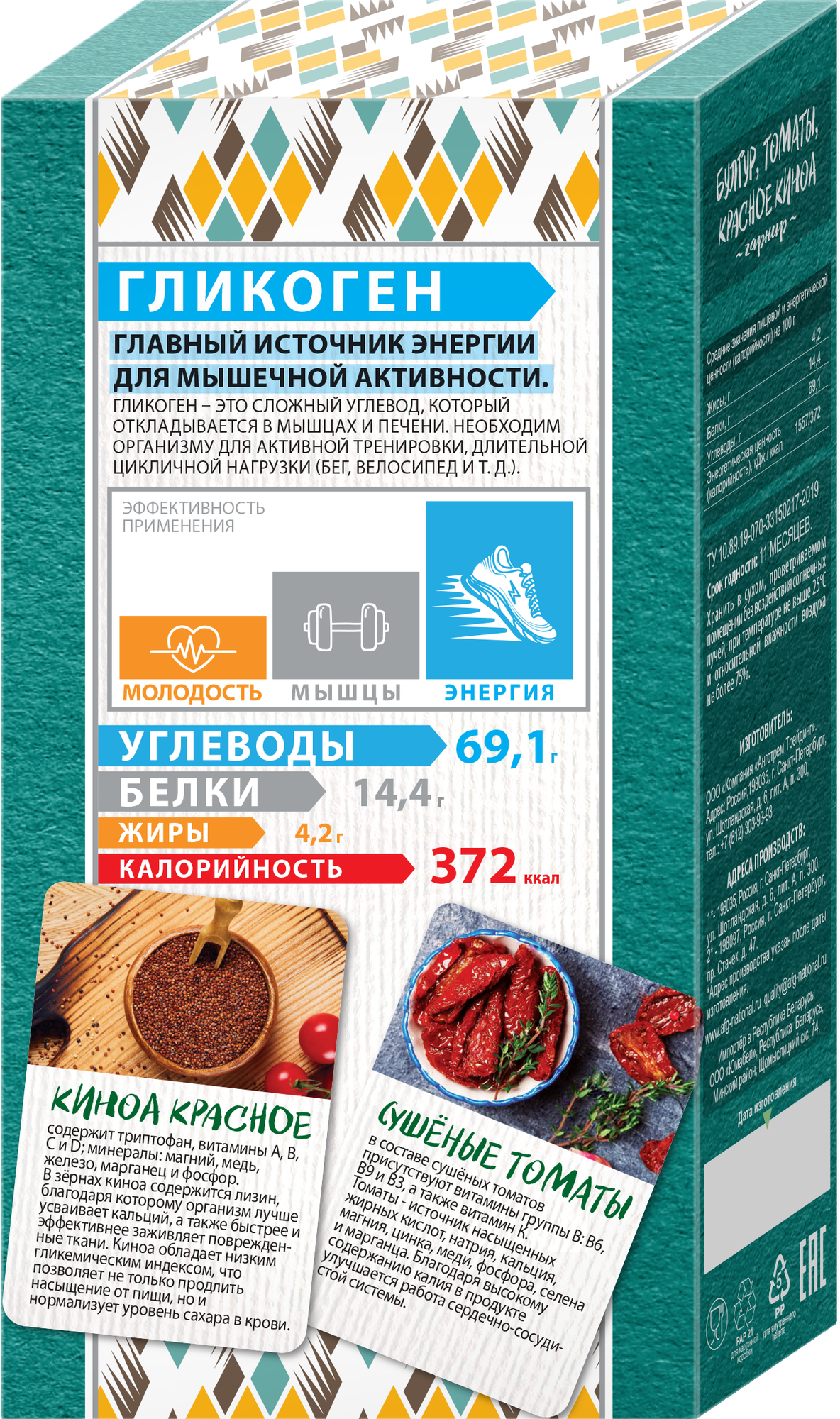 | Состав | Крупа булгур пшеничный, киноа красное, томаты сушеные. Содержит глютен, может содержать следы кунжута |