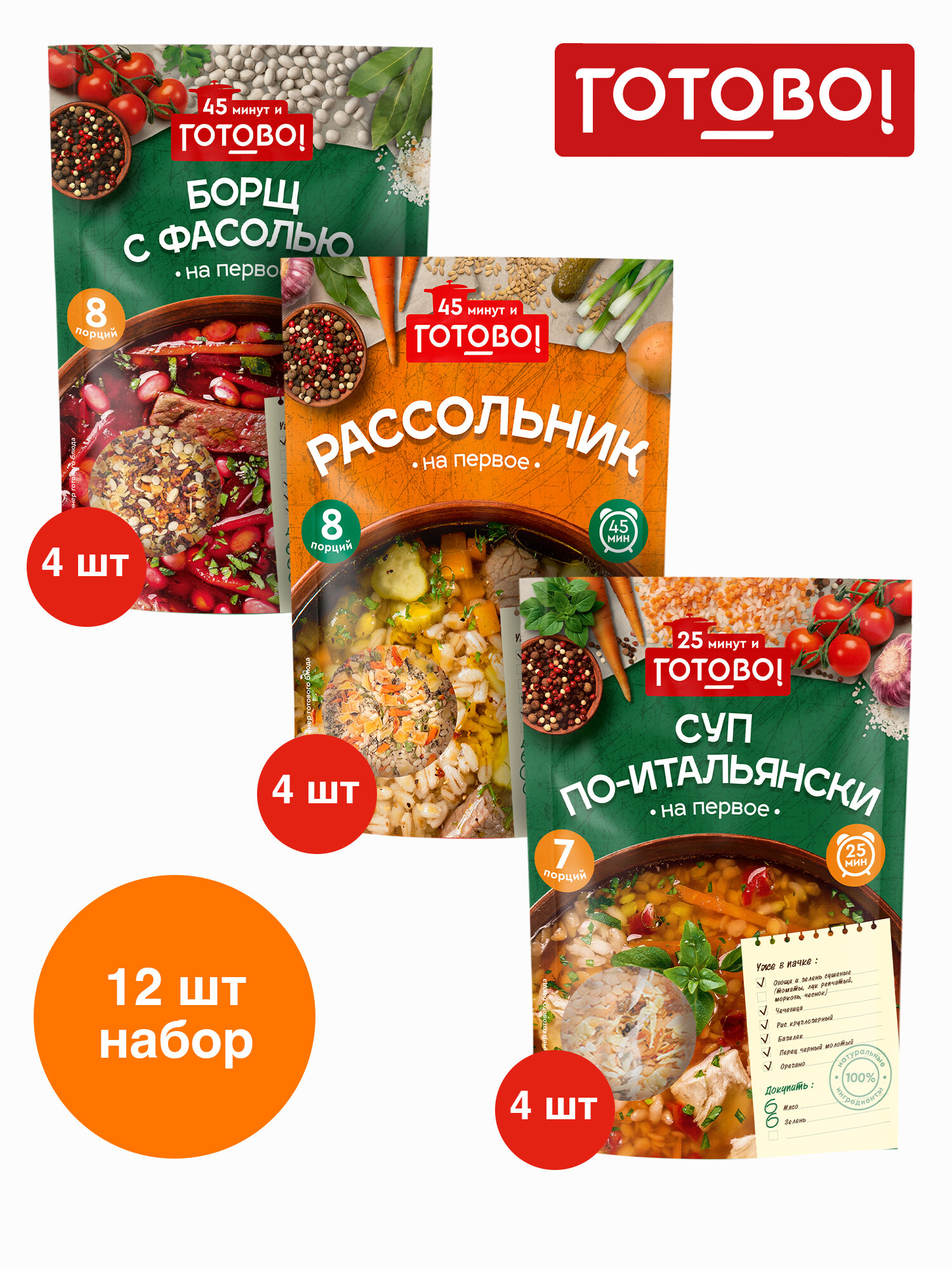 Супы Готово! 12 шт. (Суп по-итальянски 4*200г, Рассольник 4*170г, Борщ с фасолью 4*130г) информация:
