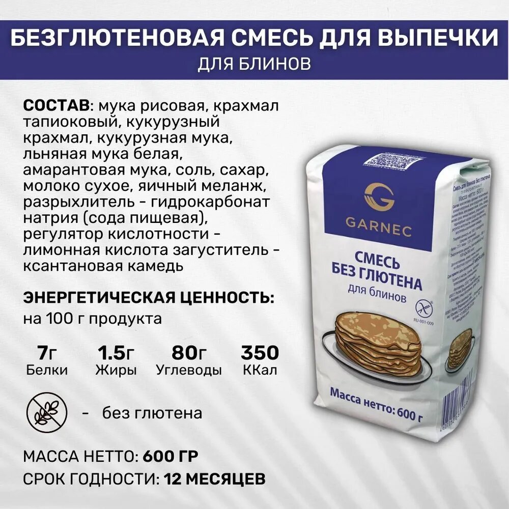 Смесь для выпечки без глютена Garnec Гарнец для Блинов 2 шт по 600 г информация: