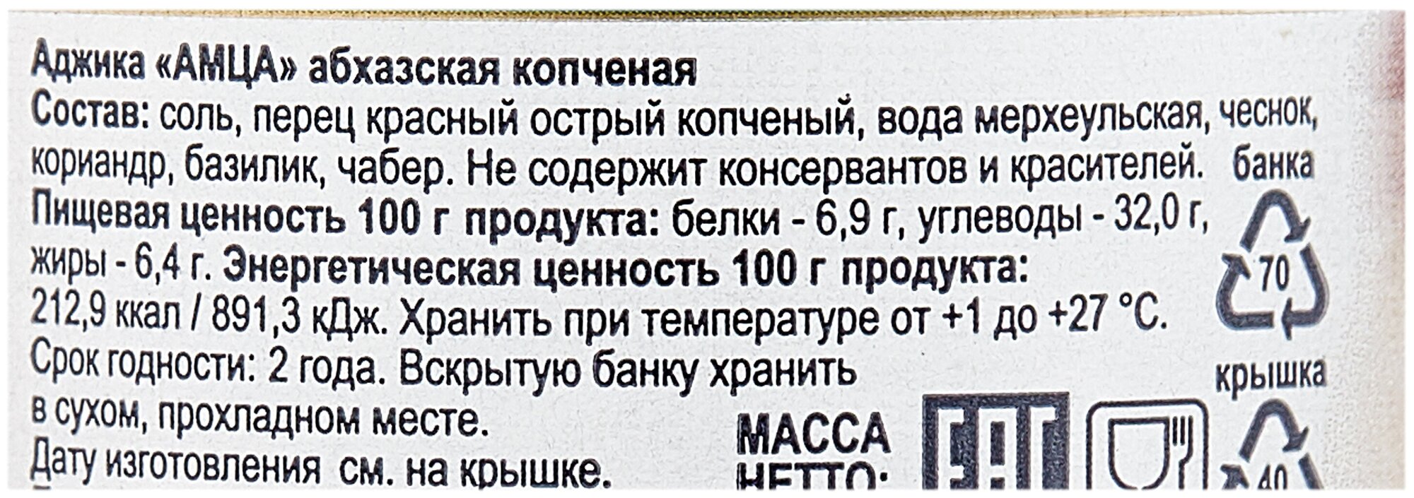 | Состав | соль, перец красный острый копченый, вода мерхеульская, чеснок, кориандр, базилик, чабер |