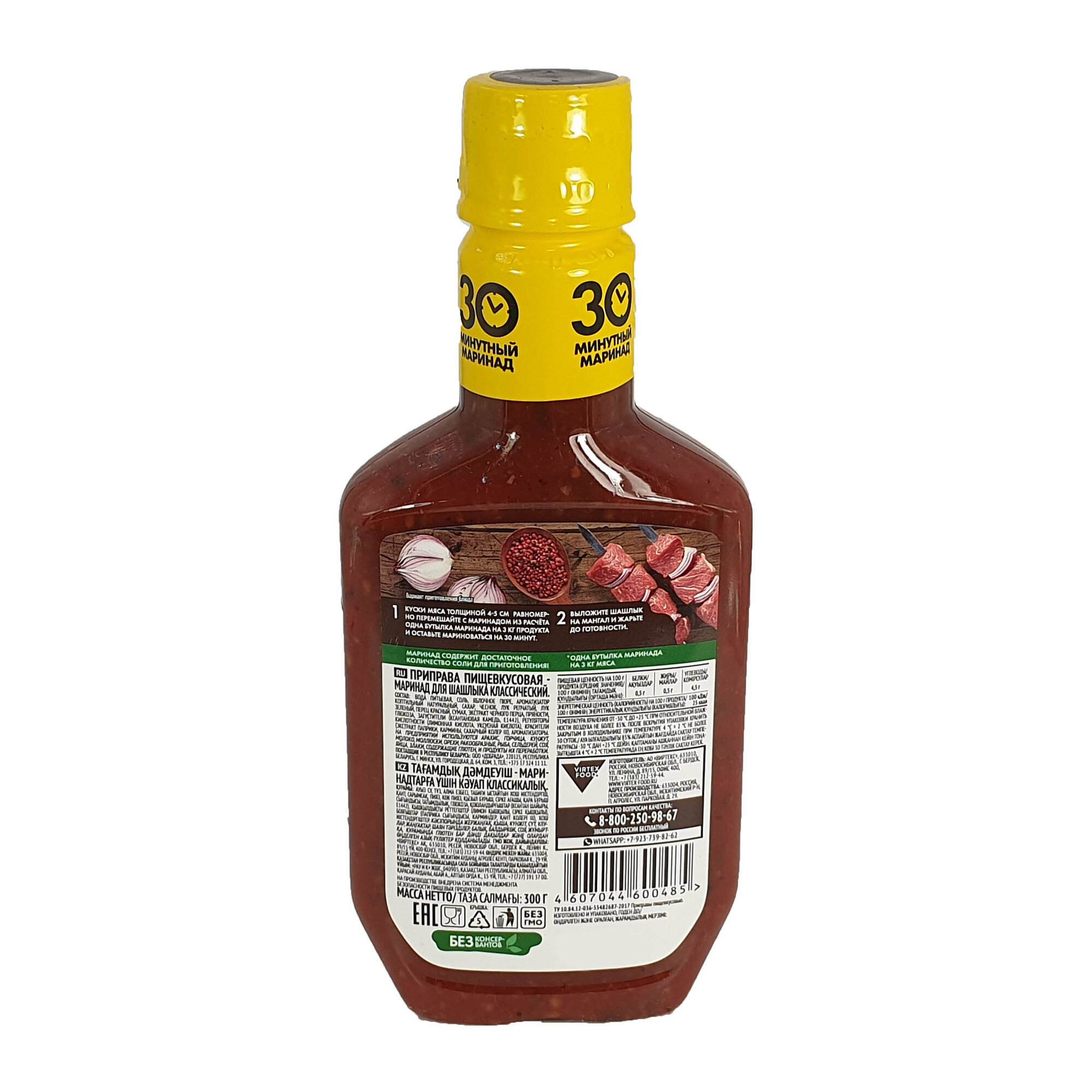| Состав | вода, соль, пюре яблочное, натуральный коптильный ароматизатор, порошок томатный, сахар, лук, сумах, кориандр, перец красный, чеснок, лук зеленый, зира, перец черный, регуляторы кислотности - кислота уксусная, кислота лимонная, загустители - крахмал кукурузный модифицированный, камедь ксантановая, ароматизаторы в т.ч. натуральные, красители натуральные - экстракт паприки, сахарный колер, кармин, консерванты - сорбат калия, бензоат натрия. |
