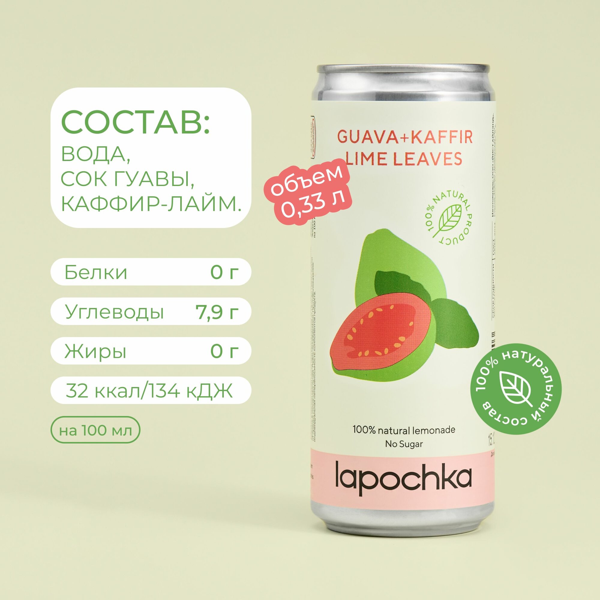 Натуральный лимонад без сахара LAPOCHKA Гуава + Каффир-лайм 20 х 0,33 л информация: