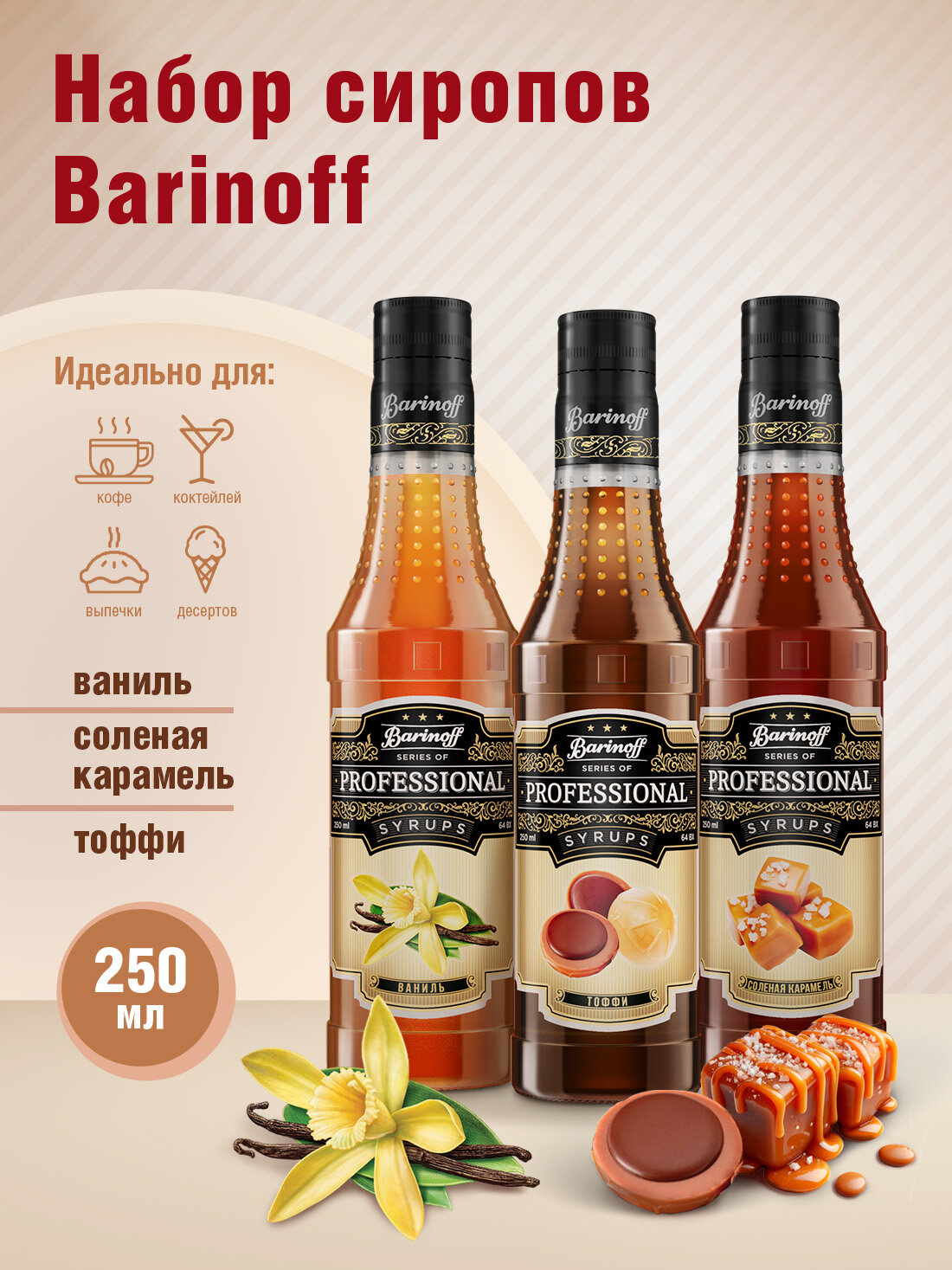Набор сиропов Barinoff для кофе и чая Ваниль, Соленая карамель, Тоффи (3 шт по 330 г /250 мл) информация: