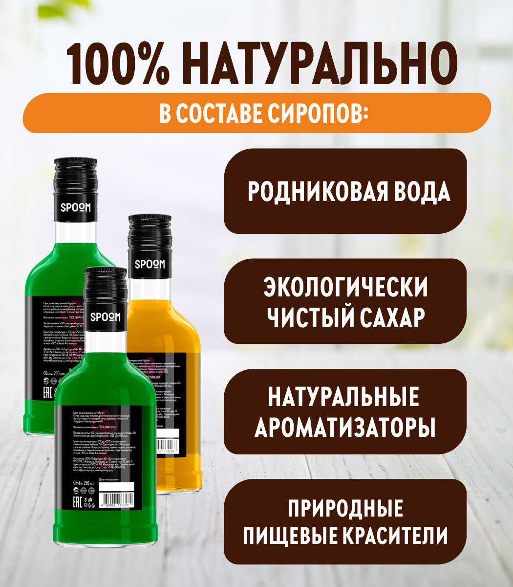 | Состав | Cироп Spoom "Ирландский крем", 250 мл: сахар, вода питьевая, регулятор кислотности лимонная кислота, ароматизатор натуральный «Ирландский крем», краситель натуральный «Карамельный колер»; Cироп Spoom "Французская карамель", 250 мл: сахар, вода питьевая, регулятор кислотности лимонная кислота, ароматизатор натуральный «Карамель», краситель натуральный «Карамельный колер»; Cироп Spoom "Макадамия", 250 мл: сахар, вода питьевая, регулятор кислотности лимонная кислота, ароматизатор натуральный «Макадамия», краситель натуральный «Карамельный колер»; |