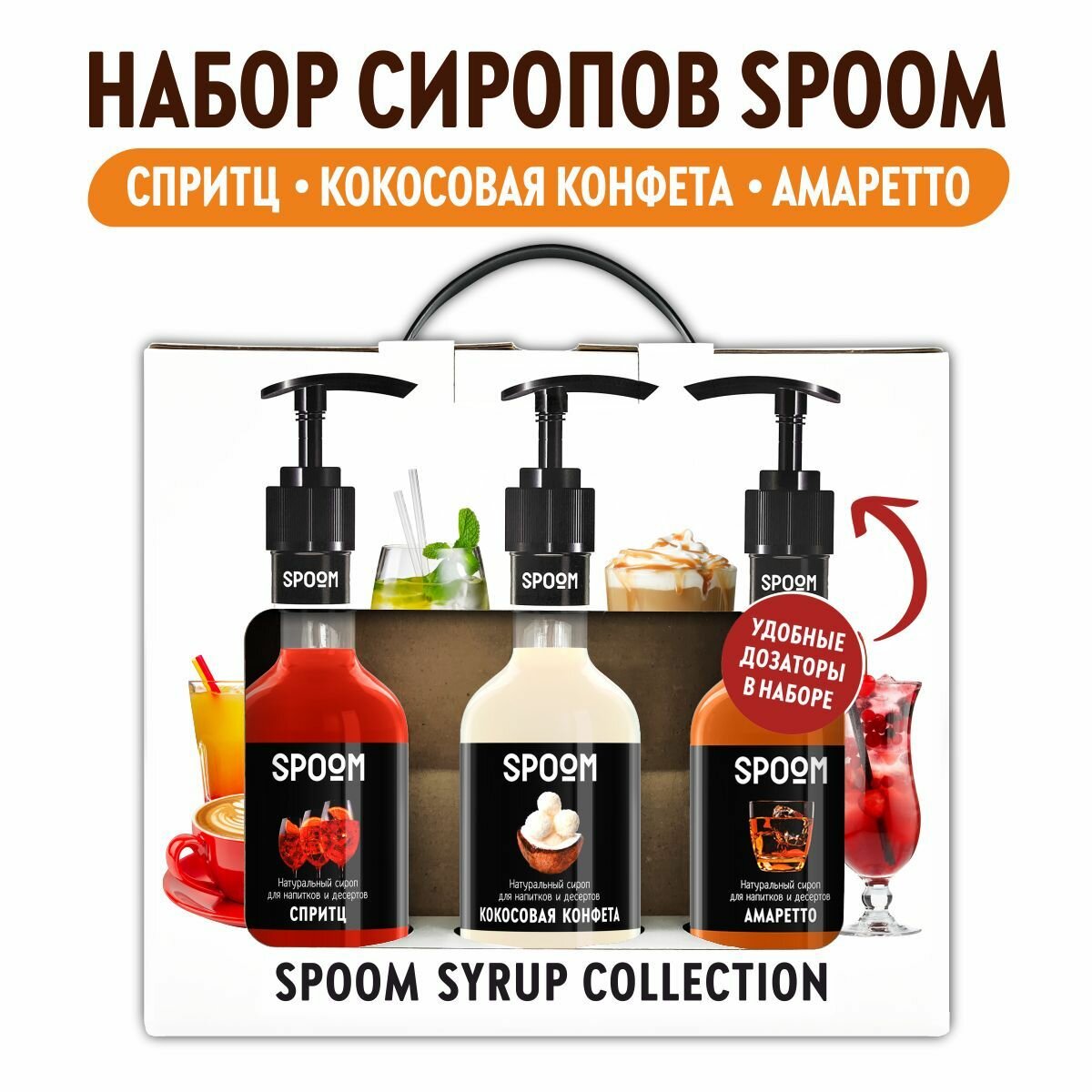 Набор сиропов Spoom №18 для коктейлей и кофе Спритц, Кокосовая конфета, Амаретто в фирменной упаковке (3 шт по 330 г / 250 мл) + 3 дозатора в подарок информация: