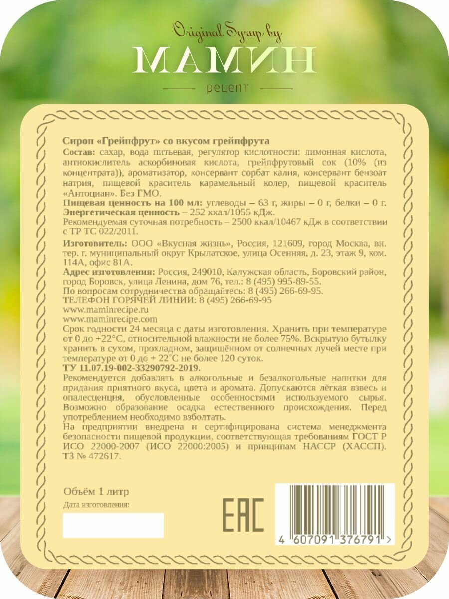 Сироп Грейпфрут мамин рецепт для кофе и коктейлей 1л, ПЭТ. информация: