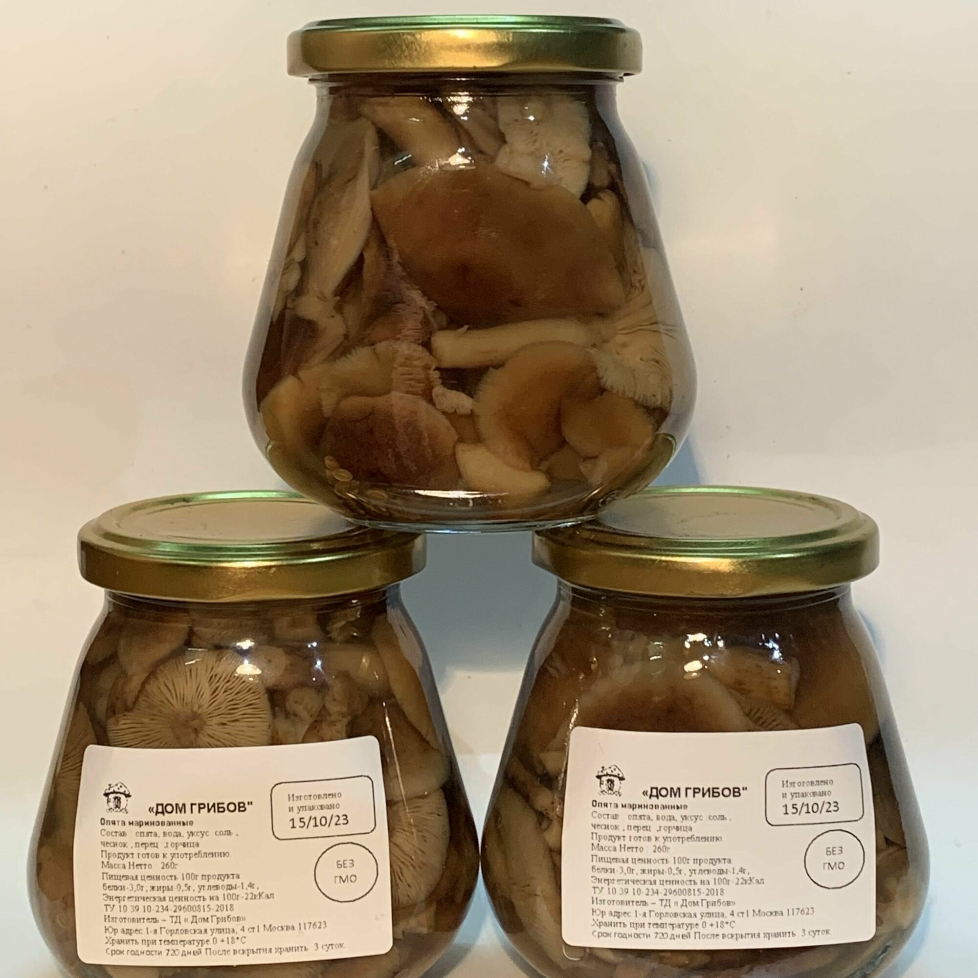 | Состав | грибы опята мелкие , маринад ( вода питьевая, соль пищевая поваренная , сахар-песок , консервант- уксусная кислота, регулятор кислотности- лимонная кислота) . |