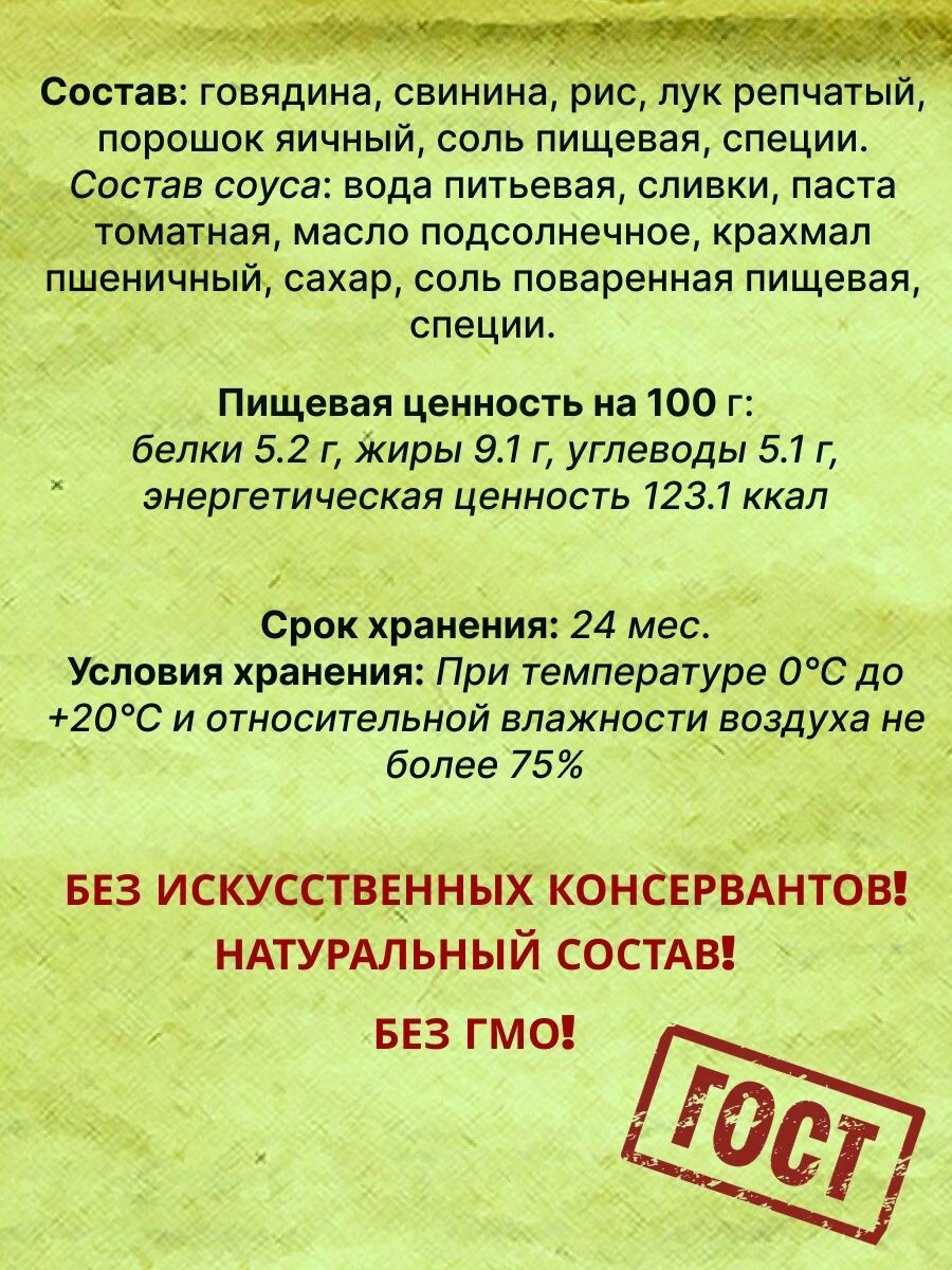 | Состав | тефтели (говядина, свинина, рис, лук репчатый,порошок яичный,соль пищевая,специи |