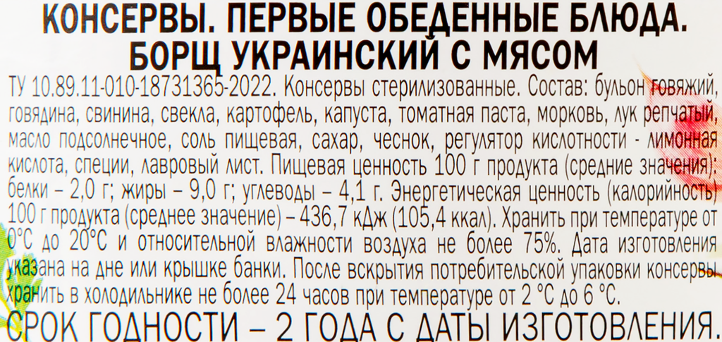 | Состав | бульон говяжий, говядина, свекла, картофель, капуста, томатная паста, морковь, лук репчатый, масло подсолнечное, соль поваренная пищевая, сахар-песок, чеснок, регулятор кислотности - лимонная кислота, специи, лавровый лист |