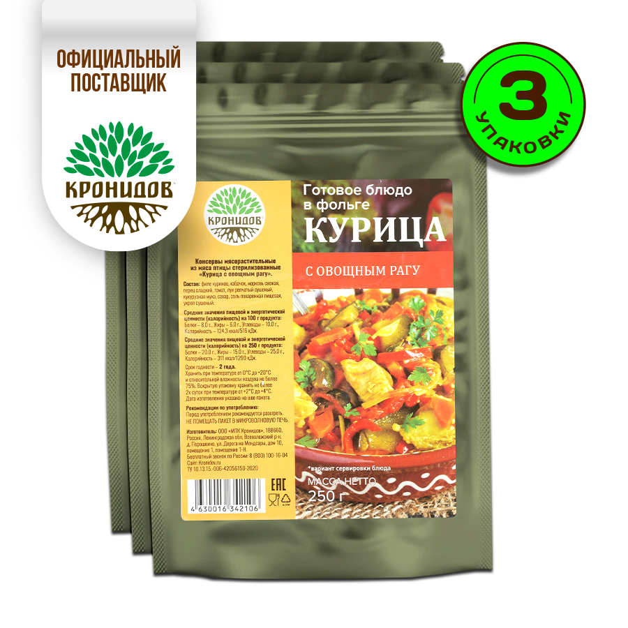 Готовое блюдо в реторт-пакете "Курица с овощным рагу" Кронидов. Сухой паек для охоты, рыбалки, в поход. Набор 3 шт. по 250 г информация: