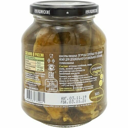 | Состав | Огурцы солёные, вода, соль, зелень укропа, регулятор кислотности молочная кислота |