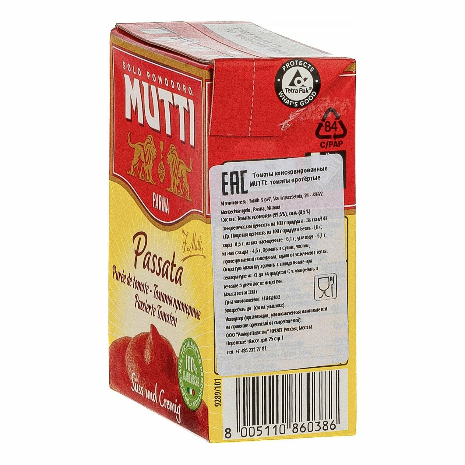 Томаты протертые MUTTI , 12 шт по 390 г тетрапак информация: