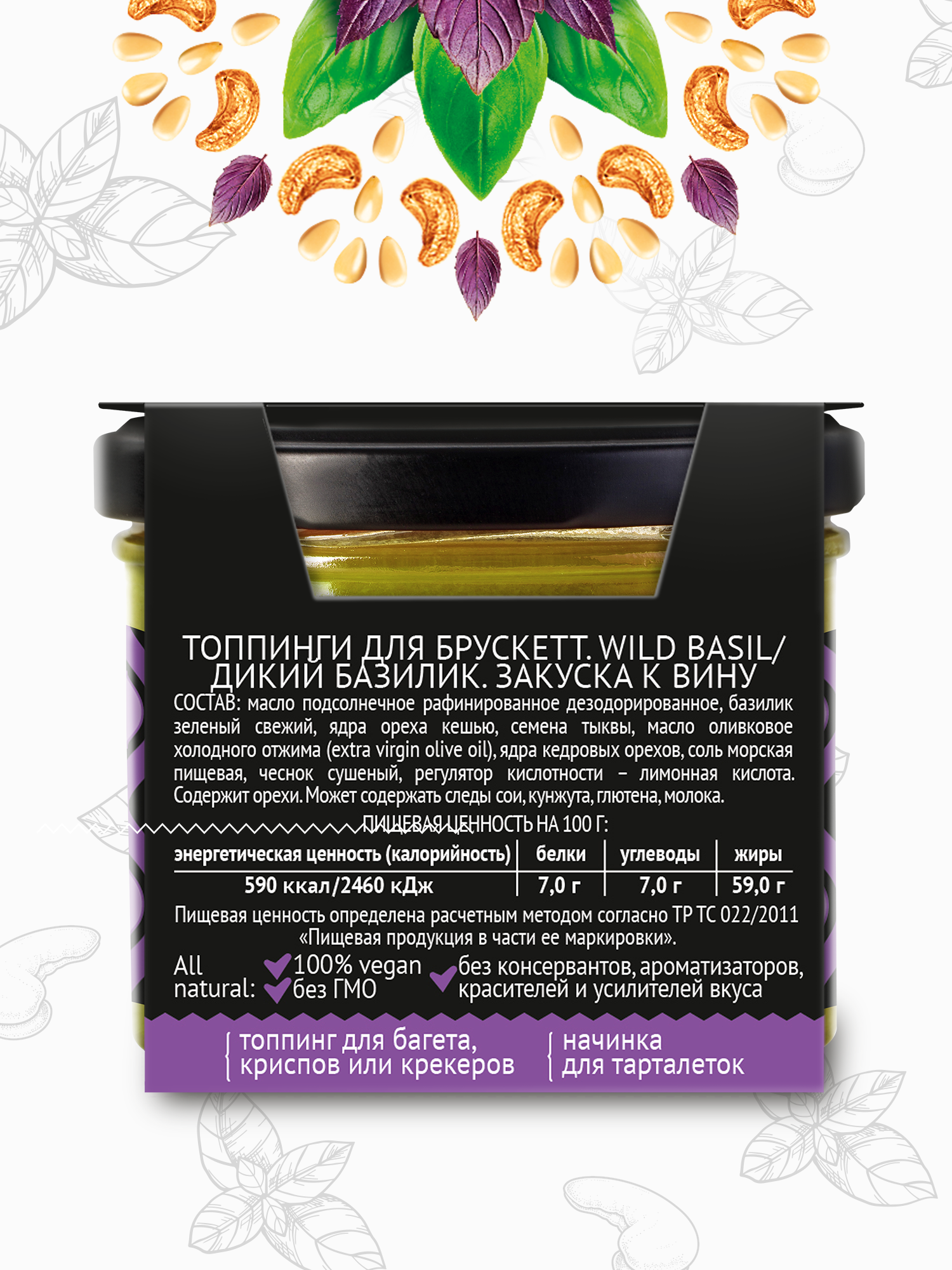 | Состав | масло подсолнечное рафинированное дезодорированное, базилик зеленый свежий, ядра ореха кешью, семена тыквы, масло оливковое холодного отжима (extra virgin olive oil), ядра кедровых орехов, соль морская пищевая, чеснок сушеный, регулятор кислотности – лимонная кислота. Содержит орехи. Может содержать следы сои, кунжута, глютена, молока. |