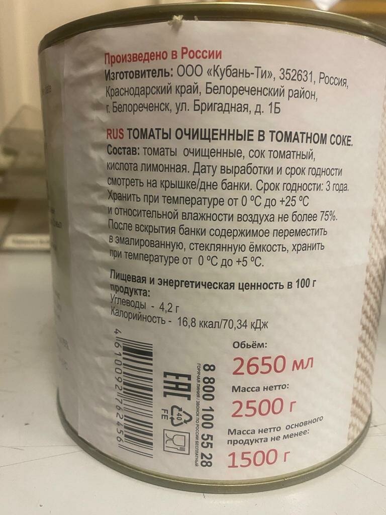 Томаты целые очищ. Кубань продукт в томатном соке ж/б 2500гр информация: