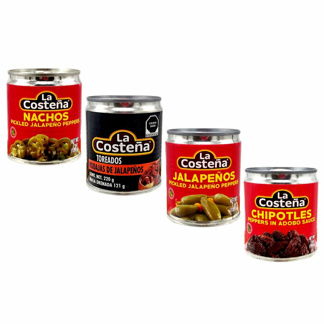 | Состав | «Перец Халапеньо целый маринованный»: вода, перец халапеньо, лук, уксус, морковь, йодированная соль, соевое масло и специи. «Перец Халапеньо кружочками маринованный»: перец халапеньо, вода, уксус, йодированная соль, лук, соевое масло и специи. «Перец Халапеньо жаренный на гриле "Rodajas de Jalapenos"»: красный перец халапеньо, соевый соус (вода, соя, пшеница, йодированная соль), лук (минимум 15%), уксус, вода, йодированная соль, растительное масло, чеснок. «Перец Чипотле в соусе Адобо»: вода, перец Чипотле, морковь, уксус, йодированная соль, тростниковый сахар, апельсиновый концентрат, приправы, пшеничная мука, смесь перцев чили, целлюлозгликолевая кислота, специи, консерванты: бензоат натрия, собрат калия (0,02%), камедь карайя, пектин и лимонная кислота. |
