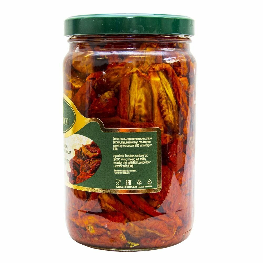 | Состав | Томаты сушеные, подсолнечное масло, специи, вода, винный уксус, соль пищевая, регулятор кислотности Е330, антиоксидант: Е300. |