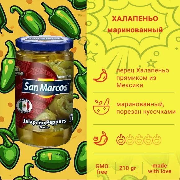 Перец "Халапеньо" резаный маринованный Jalapeno Peppers, San Marcos, Мексика, 210 г информация: