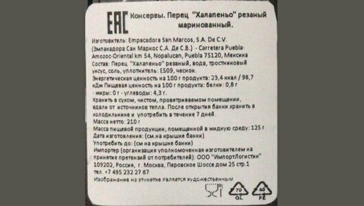 | Состав | перец "Халапеньо" резаный, вода, тростниковый уксус, соль, уплотнитель Е 509 |