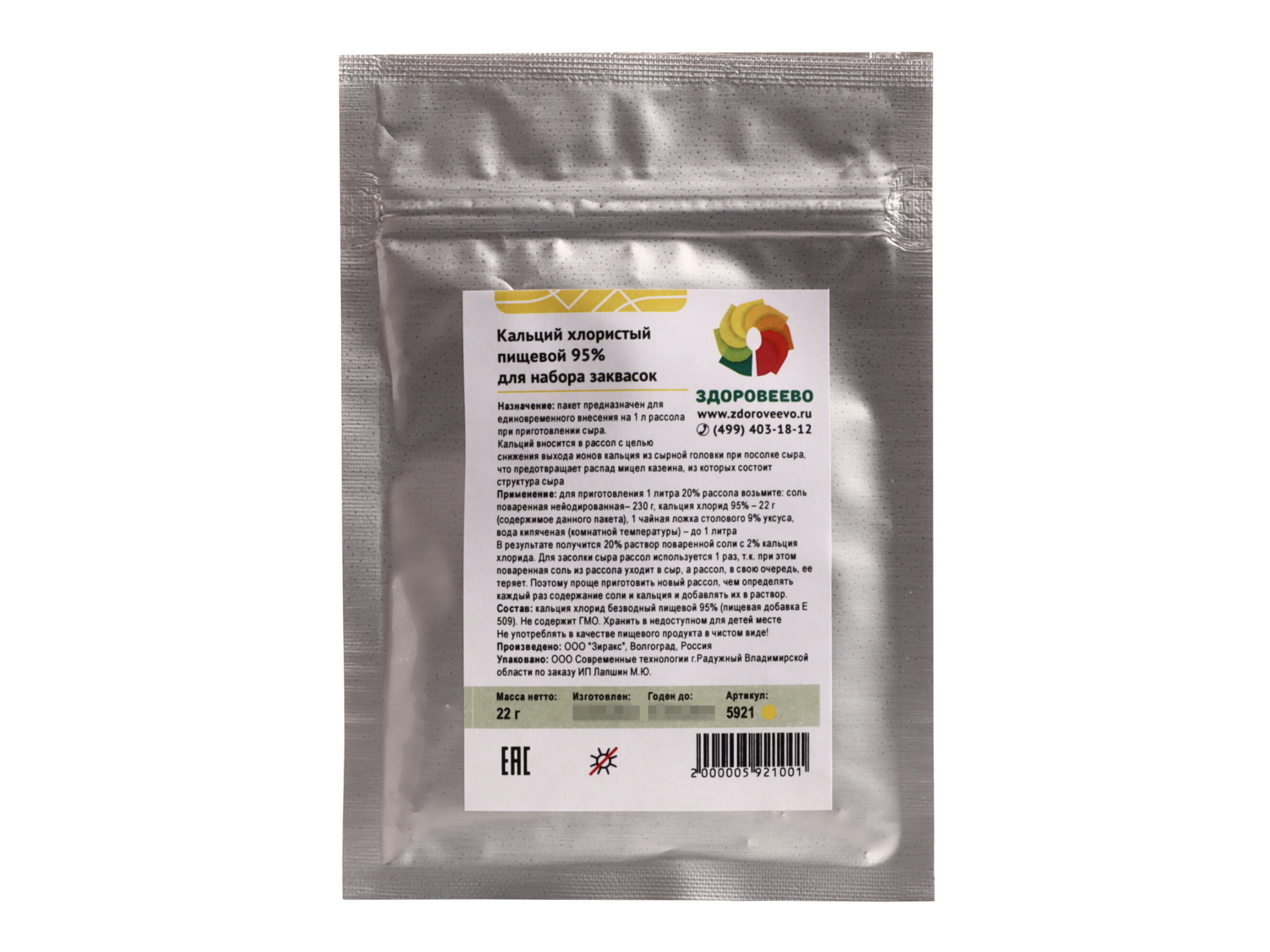 Кальций хлористый пищевой, для приготовления 1 литра 2% раствора кальция хлорида, пакет 22 г, для набора заквасок информация: