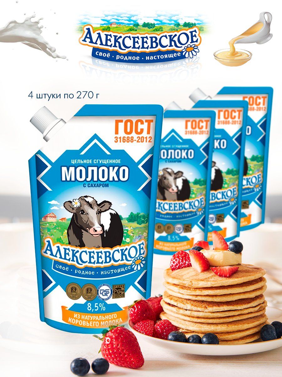 Молоко цельное сгущеное "Алексеевское" 8,5%, бзмж, д/п, 4 шт по 270г информация: