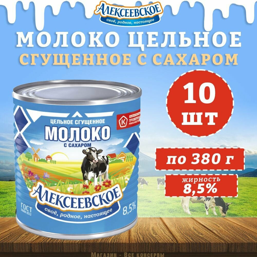 Молоко цельное сгущенное с сахаром 8,5%, Алексеевское, 10 шт. по 380 г информация:
