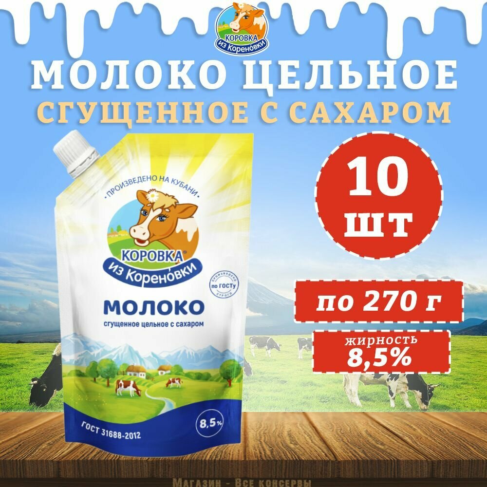Молоко цельное сгущенное с сахаром 8,5%, дойпак, КизК, 10 шт. по 270 г информация: