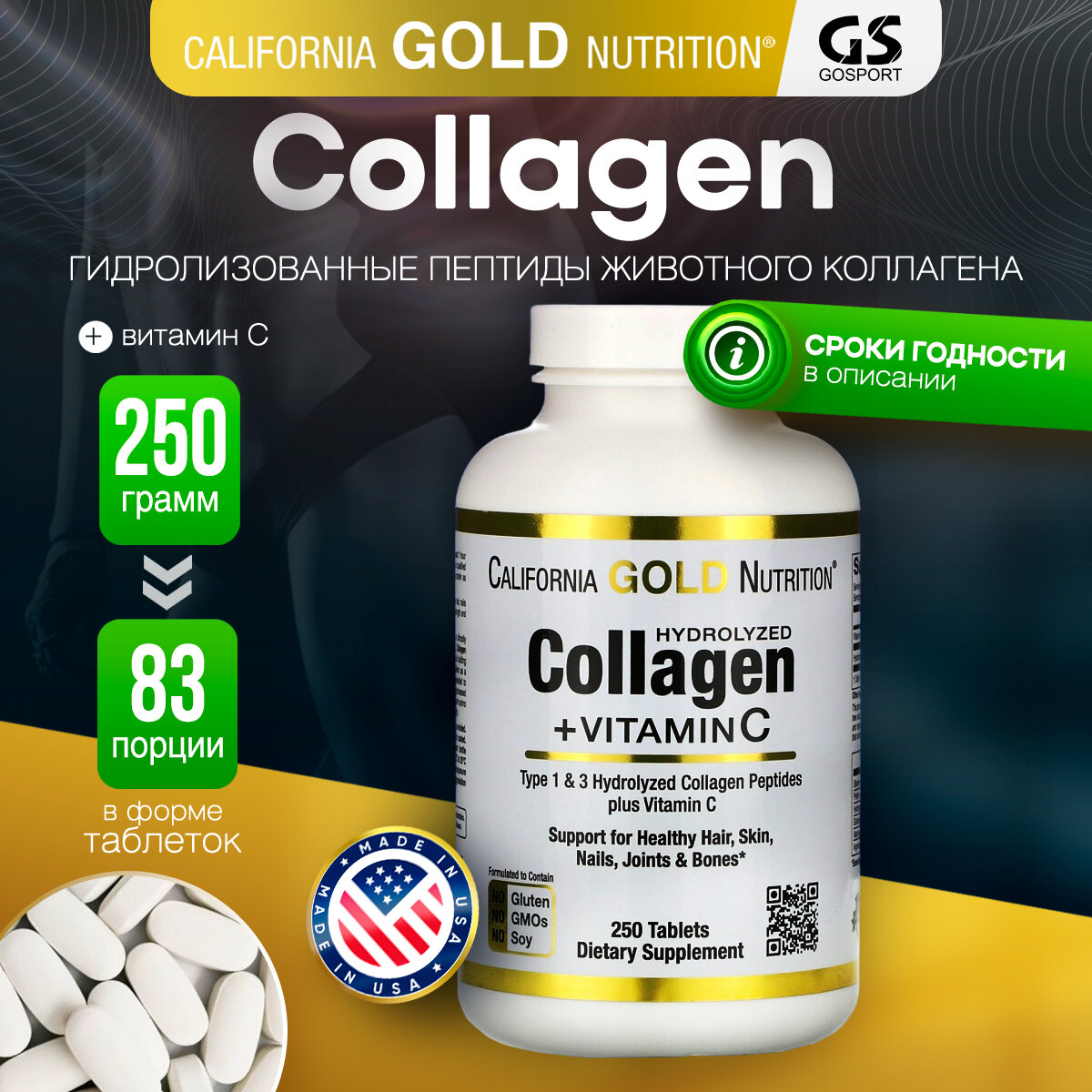 Коллаген гидролизованный California Gold Nutrition Hydrolyzed Collagen Peptides + Vitamin C, Type I III 250 таблеток информация: