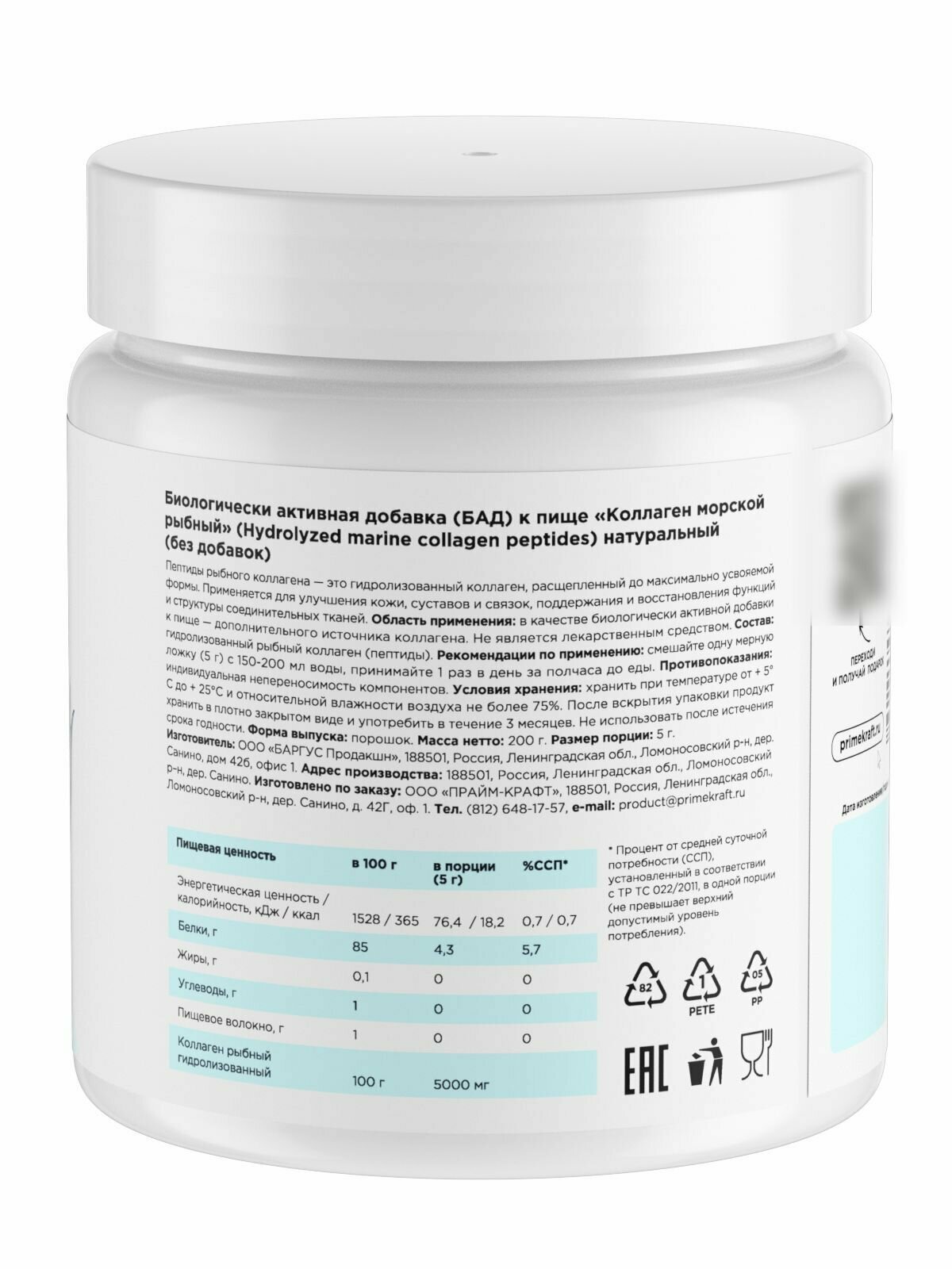 Коллаген порошок PRIMEBAR Морской / Рыбный (Hydrolyzed marine collagen peptides) Натуральный, без добавок, 200 г информация: