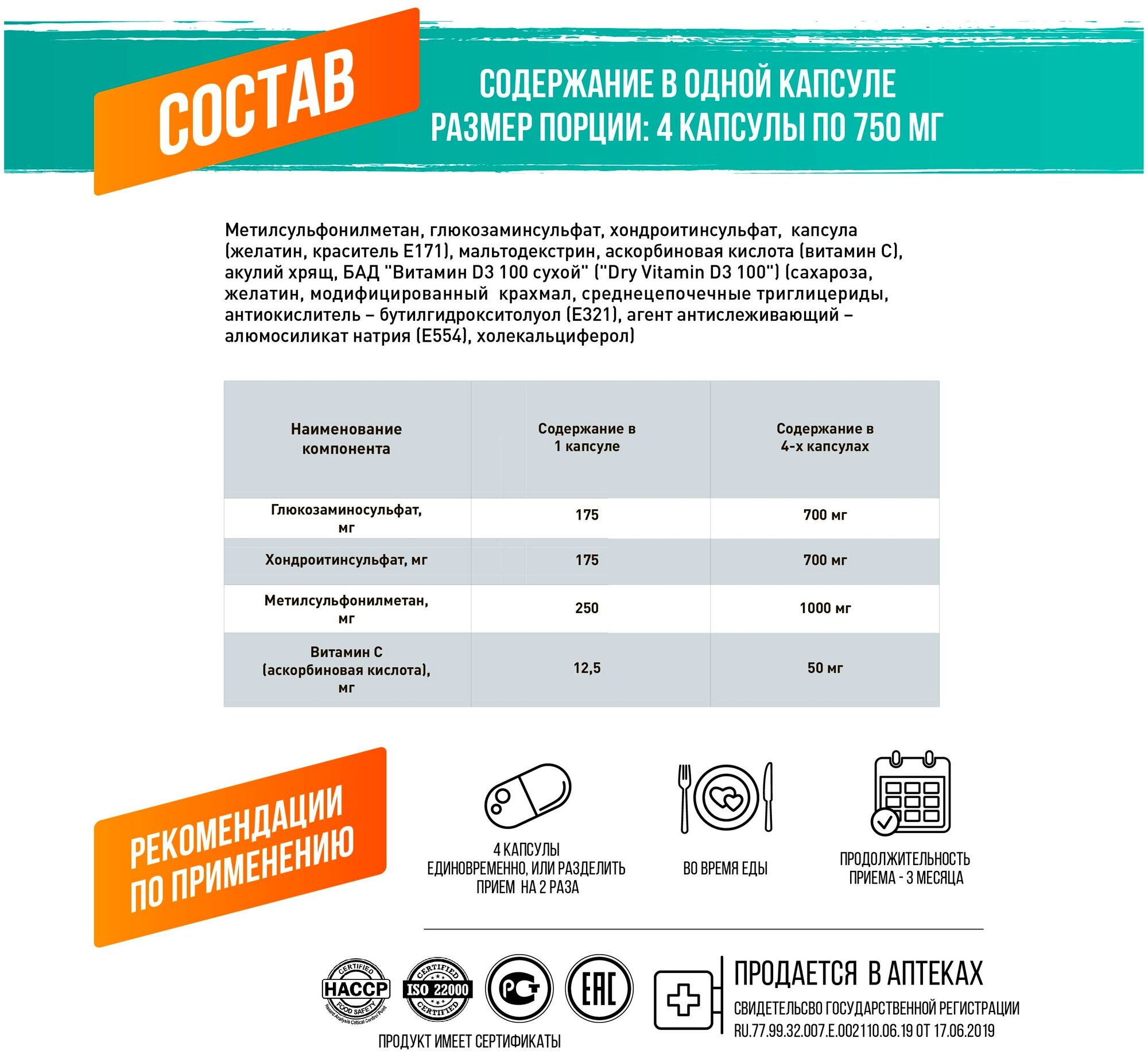 | Дополнительная информация | рекомендации по применению: принимать 4 капсулы единовременно, или разделить прием на 2 раза; состав: на 1 порцию (4 капсулы): МСМ (метилсульфонилметан) - 1000 мг, Хондроитина сульфат - 700 мг, Глюкозамина сульфат - 700 мг, Витамин С - 50 мг, Порошок акульего хряща - 39 мг, Витамин D3 - 20 мкг |