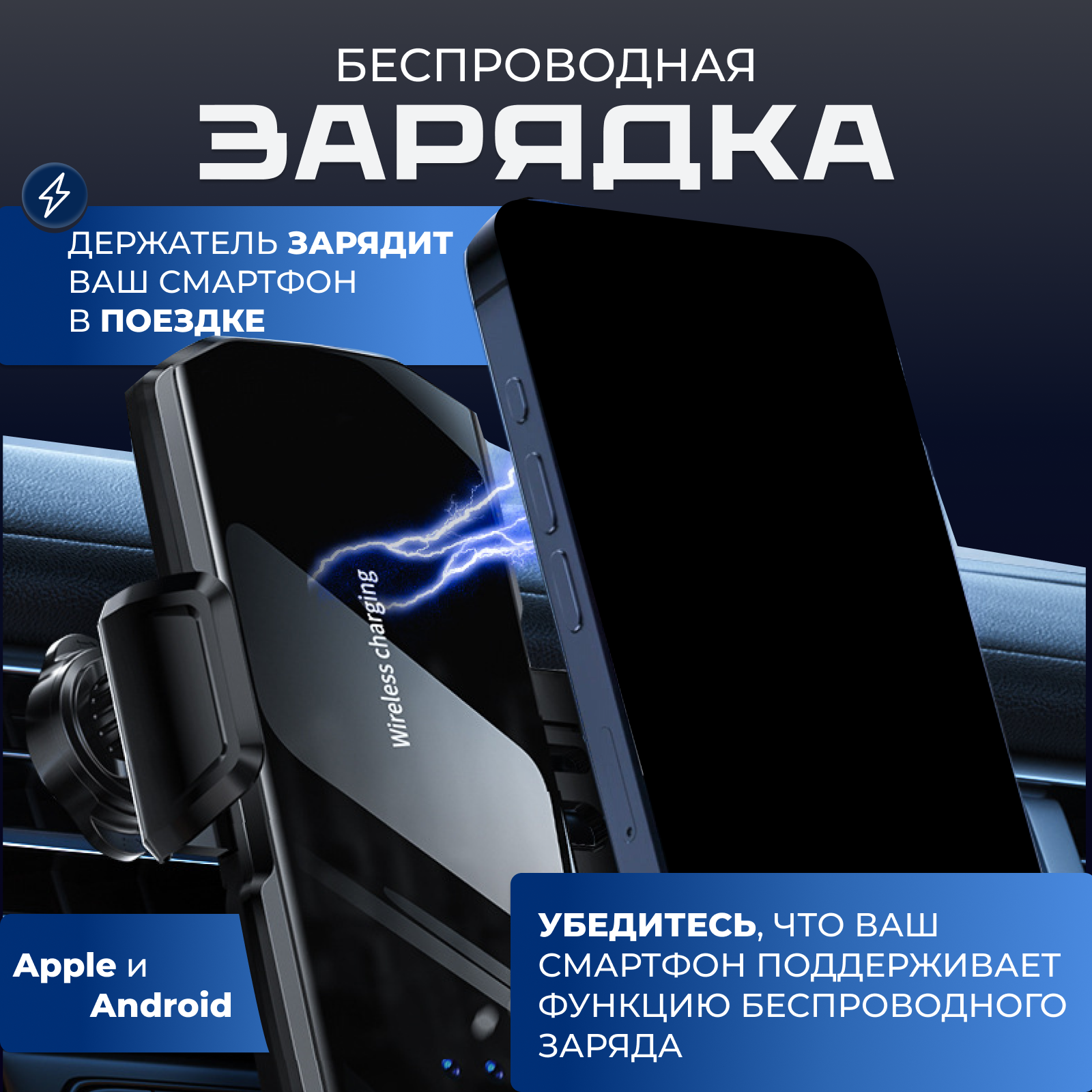 Дополнительная информация | поддержка беспроводной зарядки; магнитные переходники в комплекте; мощность 15w; рекомендуется использовать в комплекте с usb адаптером в прикуриватель с поддержкой быстрой зарядки; подходит к 90% автомобилей и 99% моделям телефонов; работает от автомобильной сети при включенном зажигании; автохолдер; крепление для телефона с зарядкой; безпроводная зарядка; зарядка через шнур; аксессуар в авто; |