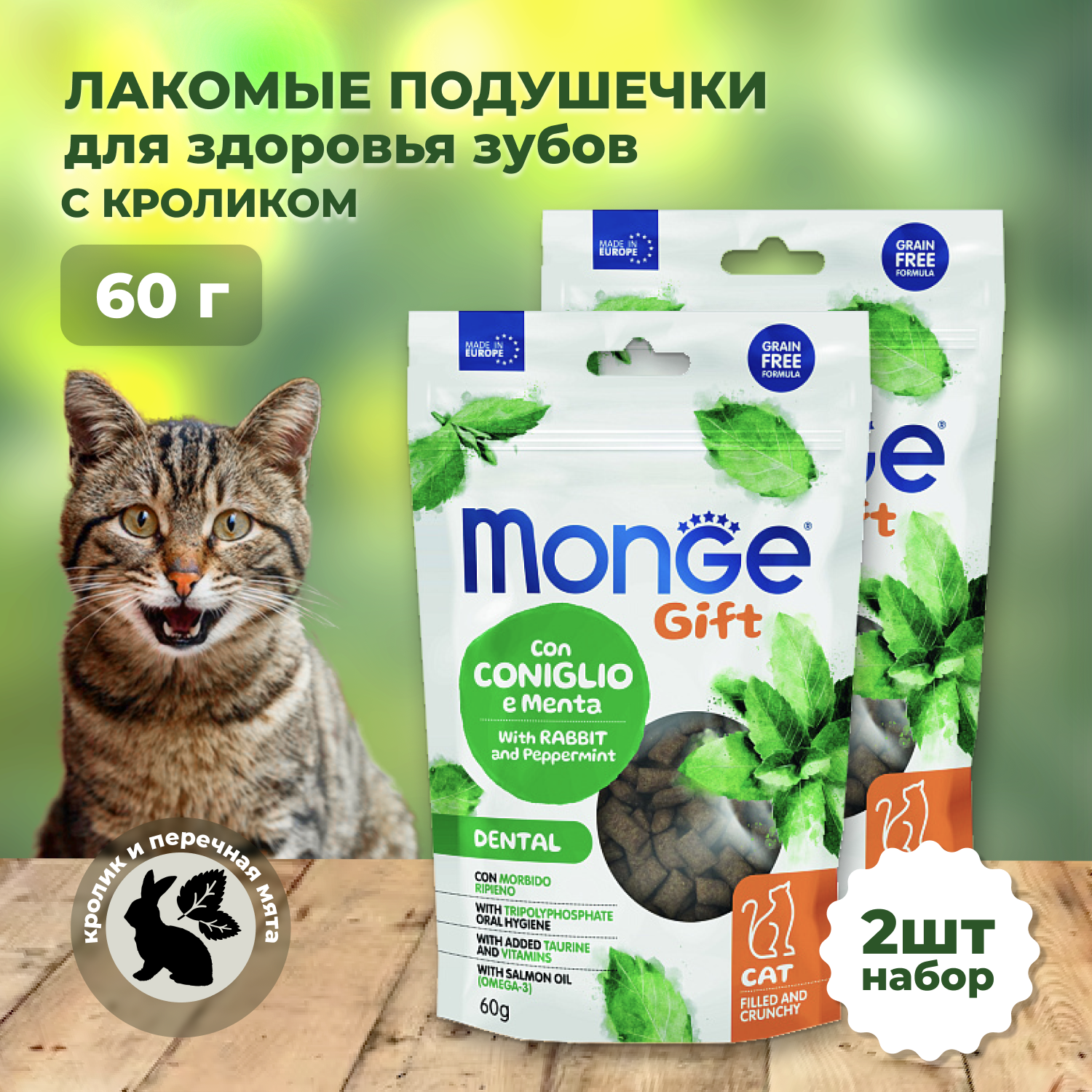 10 цен на Лакомство Monge Gift Dental для кошек Хрустящие подушечки с начинкой с кроликом и перечной мятой для чистки зубов 60 г 2 шт.