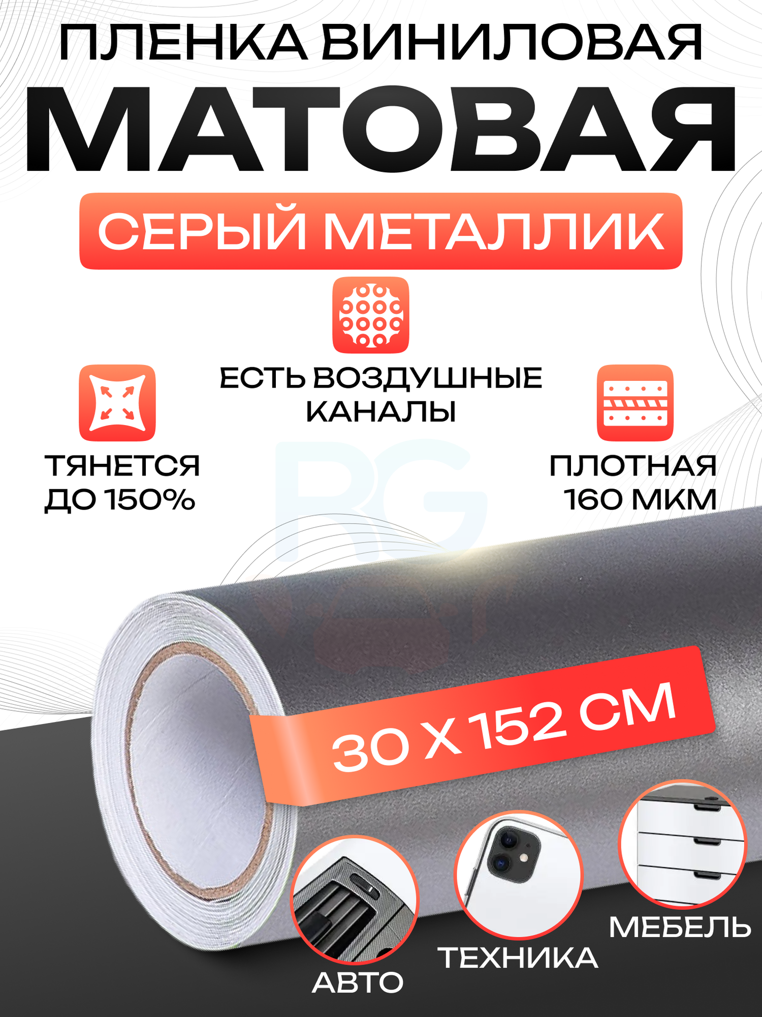 Наклейка на мебель. Виниловая самоклеящаяся защитная пленка матовая, цвет - серый, 30х152см информация: