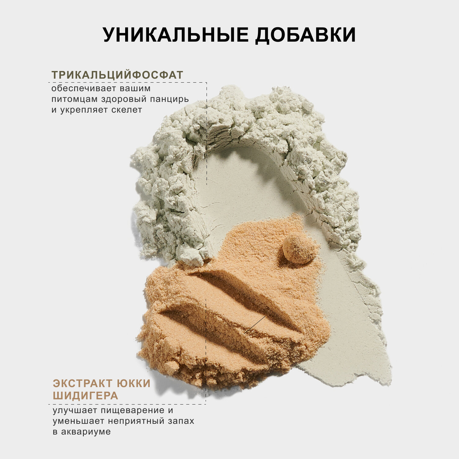 | Ингредиенты | экстракт растительного белка, зерновые культуры, мука рыбная, мука из ракообразных, мука из беспозвоночных, дрожжи, масла и жиры, экстракт юкки, витаминно-минеральный премикс, содержащий: витамины – A, D3, B1, B2, С; микроэлементы – Ca, P, Fe, Mn, Zn; красители, антиоксиданты. |