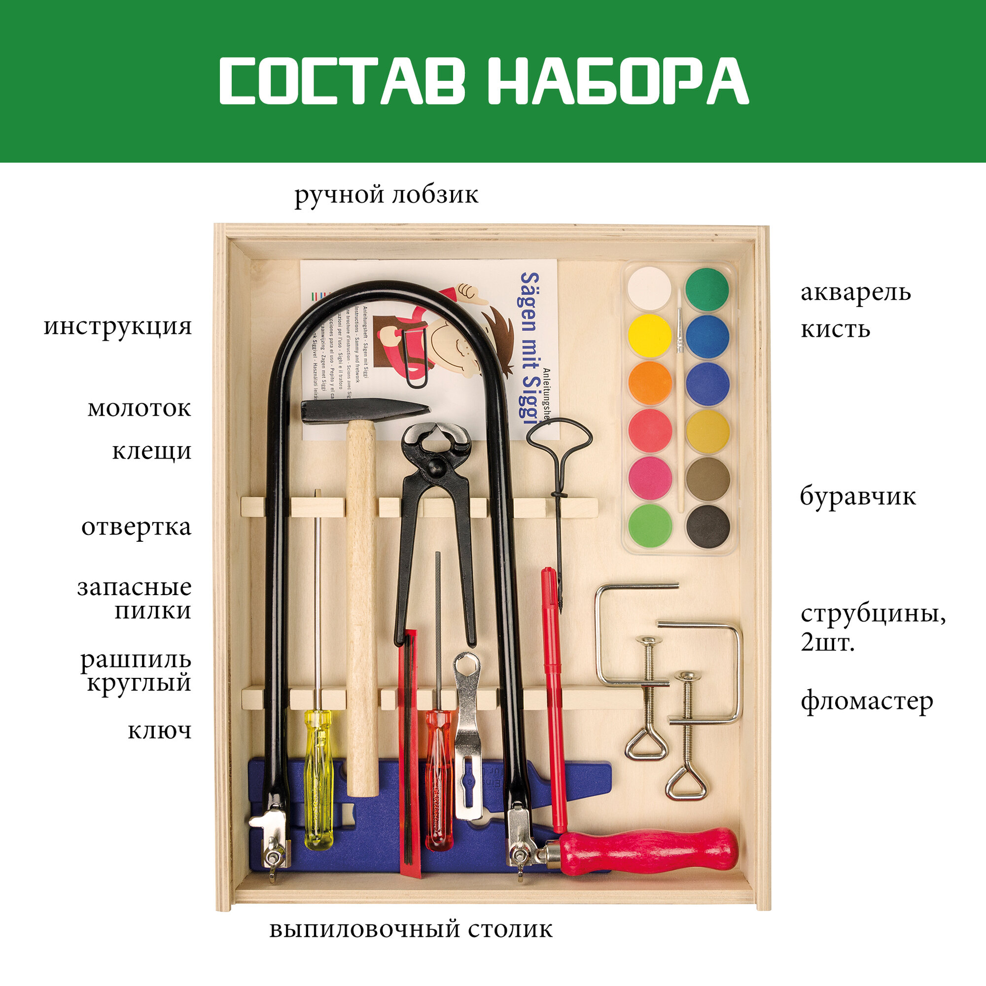 Ящик с инструментами для работы по дереву с лобзиком и струбцинами Pebaro (429S) информация:
