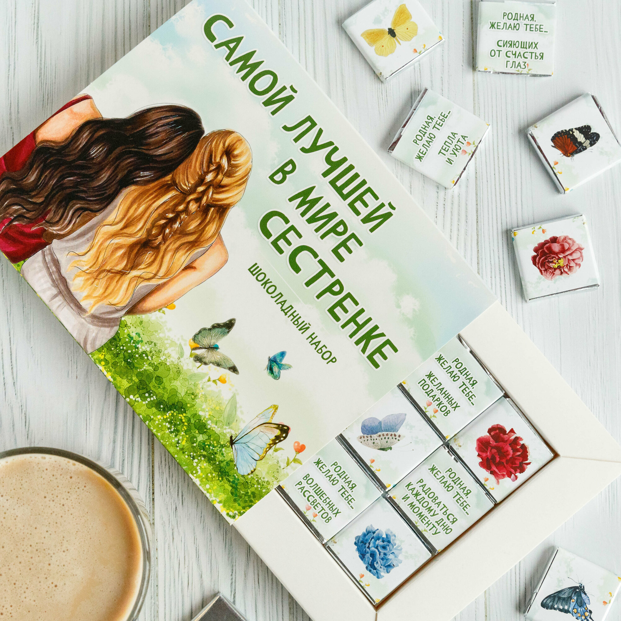 | Дополнительная информация | подарочный набор шоколада; сестре; на девичник; шоколадная открытка; мини шоколад; сладкий сюрприз; бокс со сладостями; конфеты женщине; креативный; оригинальный; подарок на память; милые надписи; добрые пожелания; сестренке; идея для подарка; дополнение; красивый; вкусный; на день рождения; юбилей; праздник |