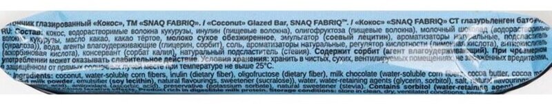 | Состав | кокос, водорастворимые волокна кукурузы, инулин (пищевые волокна), олигофруктоза (пищевые волокна), молочный шоколад (водорастворимые волокна кукурузы, масло какао, какао тёртое, молоко сухое обезжиренное, эмульгатор (соевый лецитин), ароматизаторы натуральные, подсластитель (сукралоза)), вода, агенты влагоудерживающие (глицерин, сорбит), соль, ароматизаторы натуральные, регулятор кислотности (лимонная кислота), антиокислитель (аскорбиновая кислота), консервант (сорбат калия), натуральный подсластитель (стевия) |
