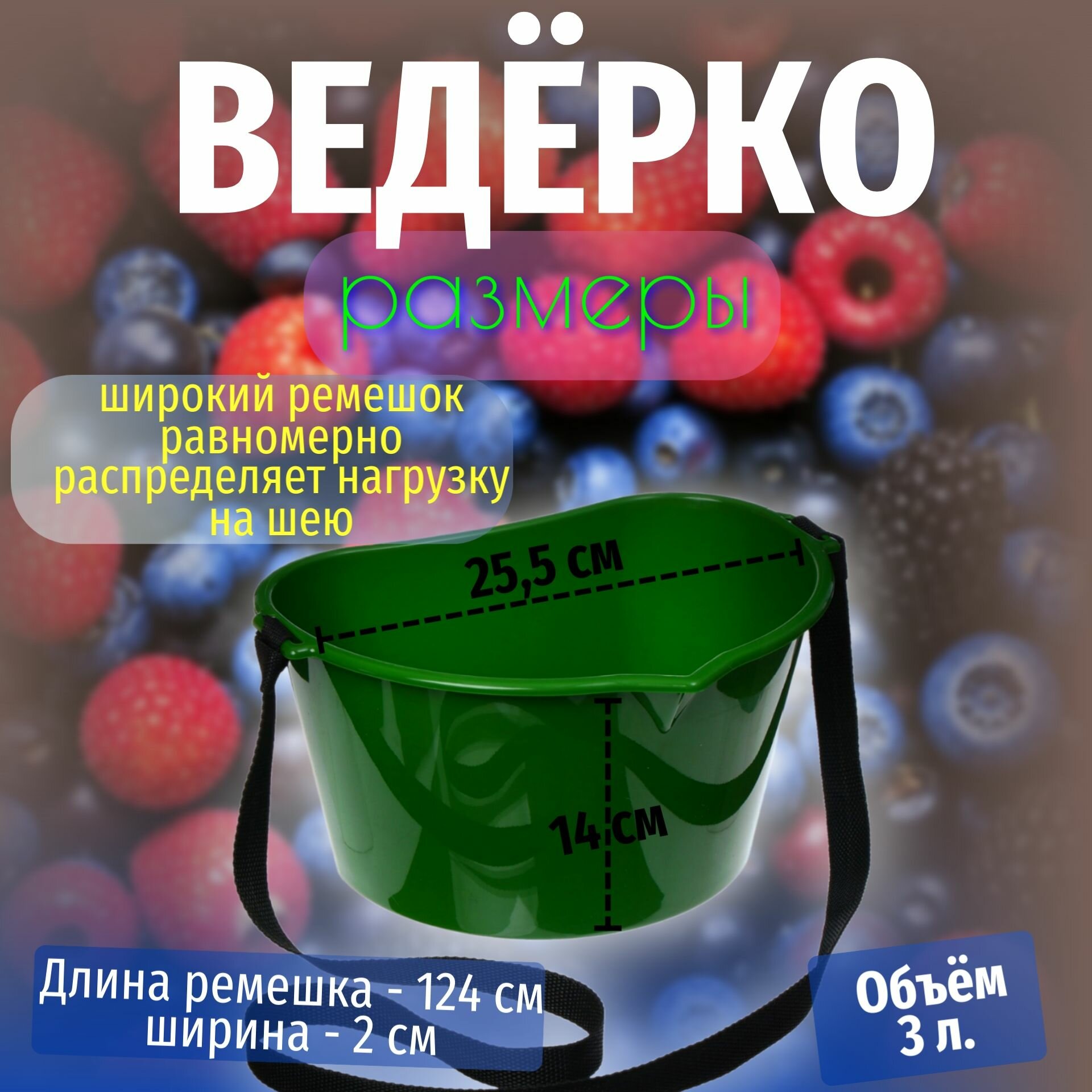 Отзывы на Ведерко ёмкость для сбор ягод, фруктов и овощей на ремешке. Объём - 3 литра. Цвет - темно-зеленый. Размер - 25,5 см х 20 см х 14 см.