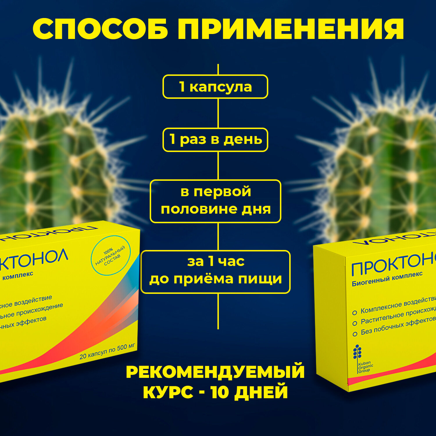 | Способ применения и дозы | 2 раза в день (утро/вечер), по 1 капсуле, запивая большим количеством воды (100-150мл). Независимо от приема пищи. Рекомендуемый курс-30 дней, с повторным применение курса после 30 дневного перерыва |