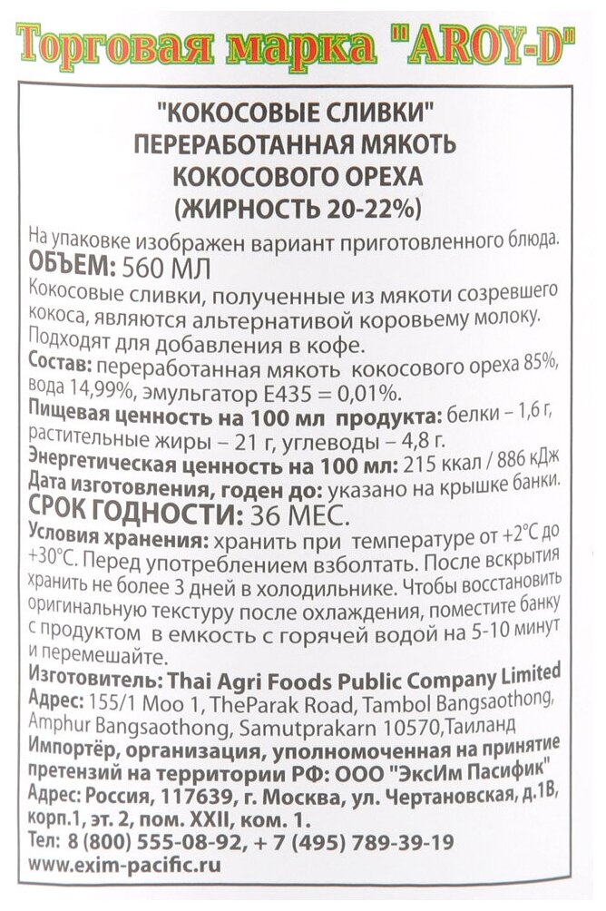 Сливки Aroy-D кокосовые 21%, 560 г, 560 мл информация: