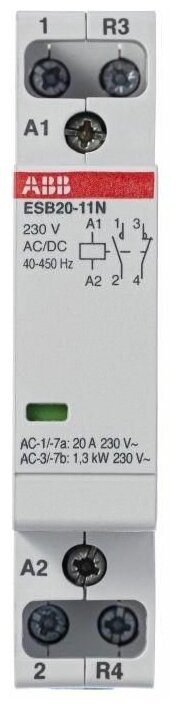Отзывы на 1SBE121111R0611 Контактор ESB20-11N-06 модульный (20А АС-1, 1НО+1НЗ), катушка 230В AC/DC
