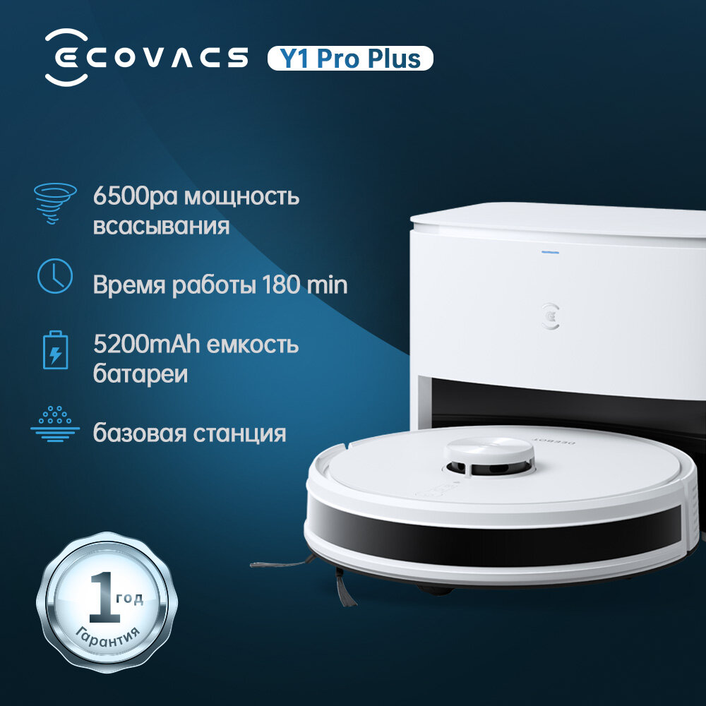 Робот-пылесос ECOVACS DEEBOT Y1 Pro Plus, сухая и влажная уборка, 6500Па 5200мАч, со станцией самоочистки, Русская версия информация: