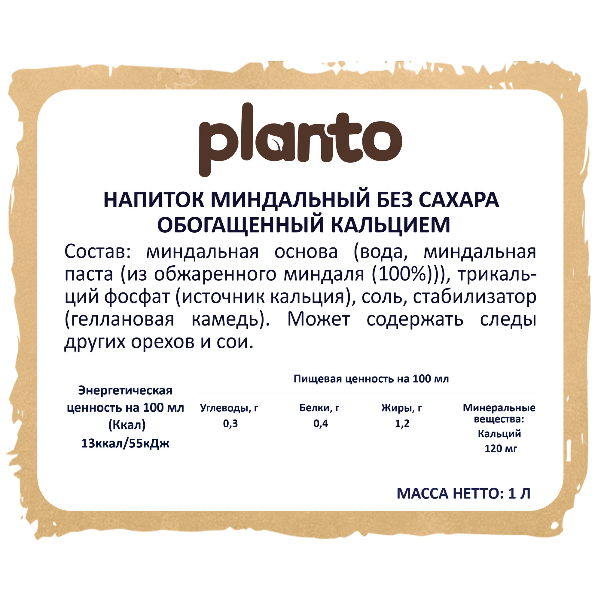 Растительный напиток Planto миндальный без сахара 1,2% 1л информация: