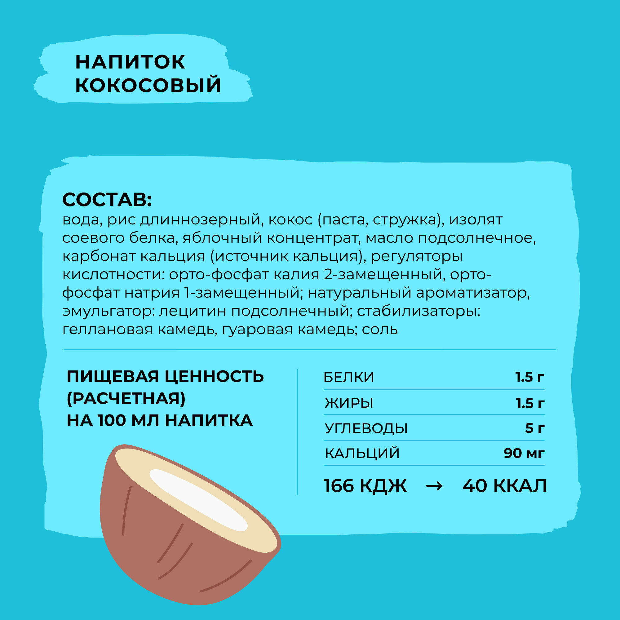 | Состав | Вода, фундук (паста, орех), рис длиннозерный, карбонат кальция (источник кальция), натуральный ароматизатор, соль морская, стабилизатор: гуаровая камедь. |