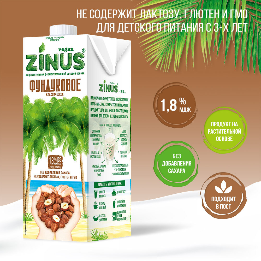 10 цен на Zinus Vegan HEZELNUT "фундуковое" 1,8% 1л. ТВА/коробка 4 шт/ Продукт на растительном сырье.