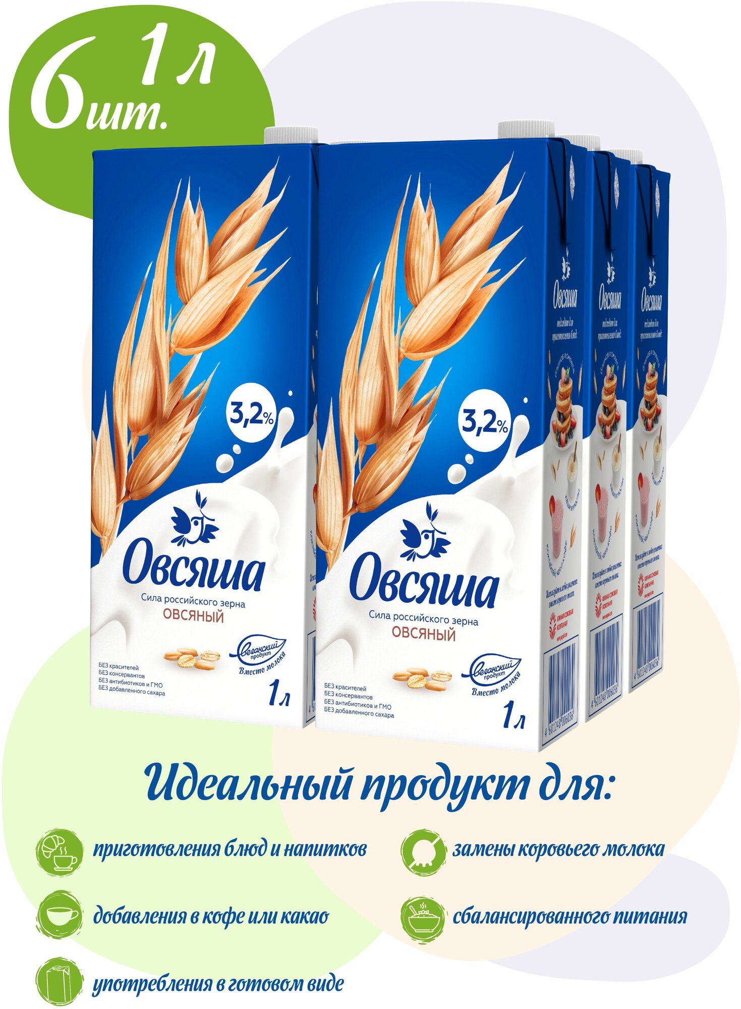 Овсяное молоко Овсяша, растительное молоко, без сахара и лактозы, жирность 3,2%, 1 литр х 6 шт. информация: