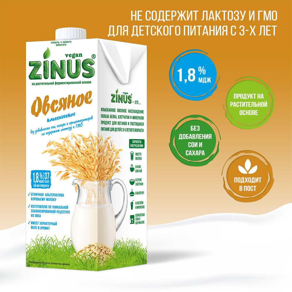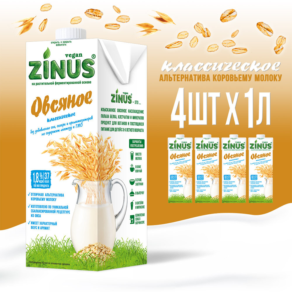 10 цен на Zinus Vegan "Овсяное" 1,8% 1л. ТВА/коробка 4 шт/ Продукт на растительном сырье.