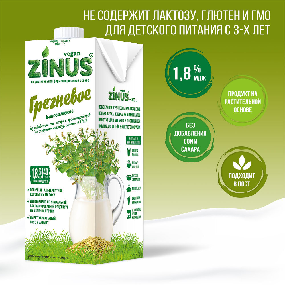 10 цен на Zinus Vegan "Гречневое" 1,8% 1л. ТВА/коробка 4 шт/ Продукт на растительном сырье.